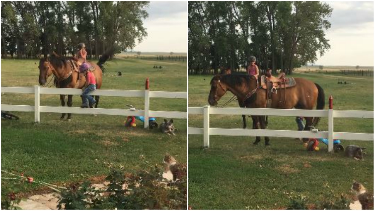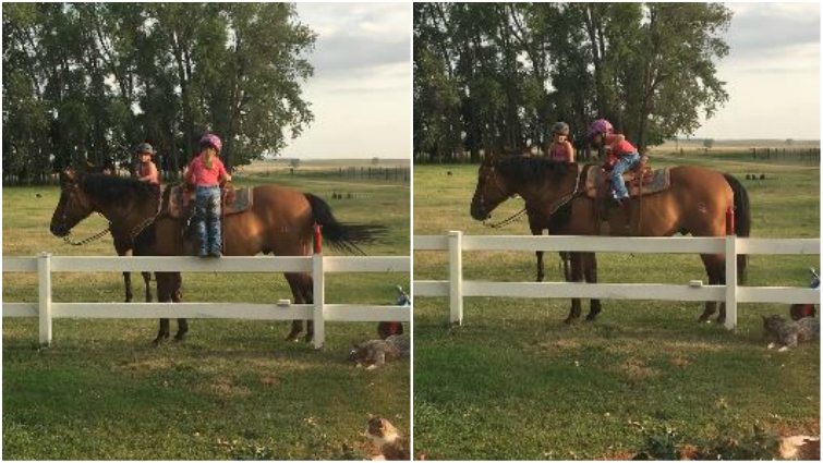 In this video that has gone viral all over the internet, this little girl proves that the brain is over brawn when it comes to this situation. The creative girl named Addie was out riding her horse with her sister, Sara one fine day. Later, the horse was a bit parched so the girl decided to give it some water so she hopped off her horse. However, she soon found out that it was not easy to hop on her horseback as it was to hop off.