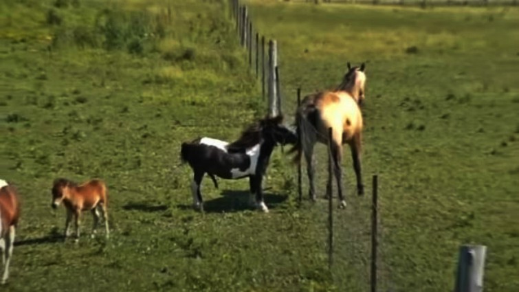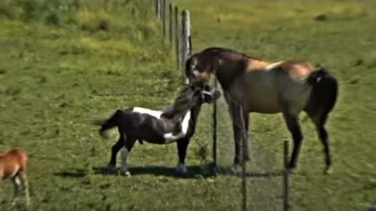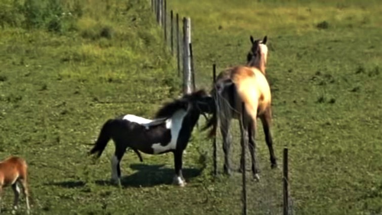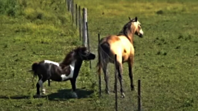 The video was recorded on Lindsay, Ontario area farm, and this mini is trying to accomplish something with a horse who is twice his size. Do you think if he could get over the fence, he’d ever face the challenge? We only can imagine the amazing ‘horsie’ conversation going on between them.
