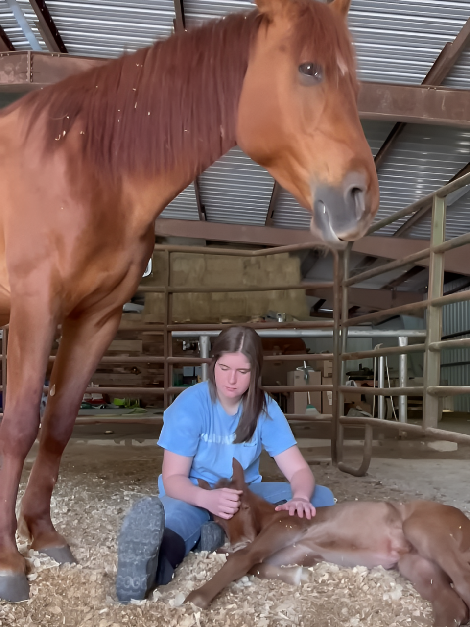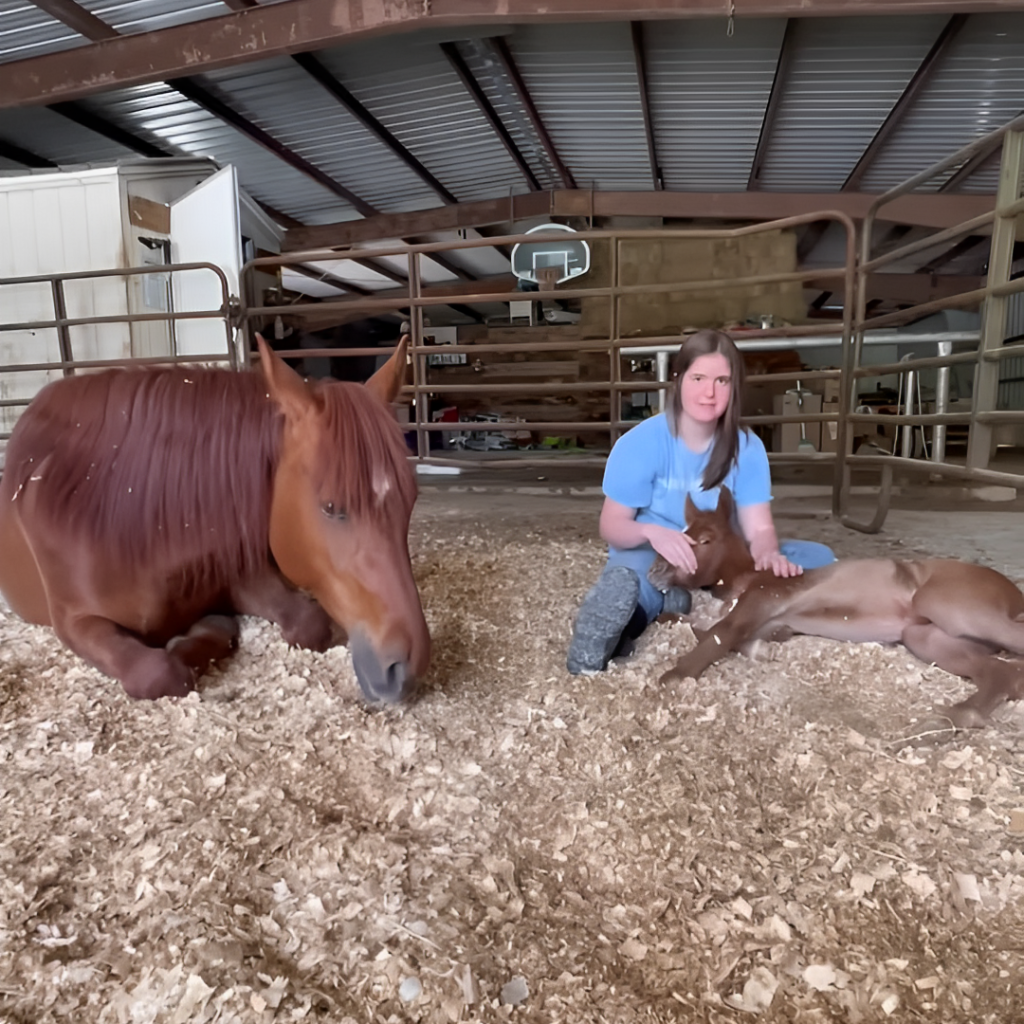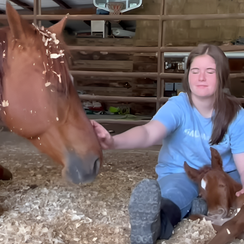 In a tender display of trust and tranquility, a video captures an adorable scene featuring Ozark, a majestic mama horse, her charming baby, and a young girl named Becca. As they relax together, the scene unfolds with the baby horse comfortably lying in Becca’s lap, finding solace and security. Beside them, Ozark remains calm and content, showcasing her comfort and trust in the presence of the girl. This video not only charms viewers but also powerfully illustrates the deep bond and mutual trust that can develop between humans and animals.