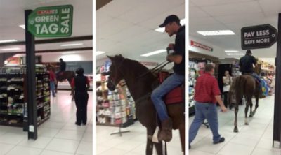 You must have heard a ‘horse walks into a bar’ joke before and maybe you had a laugh after the joke but the video you are going to watch shows a horse going into the supermarket to pick up groceries. A man rides his horse into a supermarket to do some shopping leaving the customers stunned as they don’t believe their eyes when they see the horse into the supermarket.
