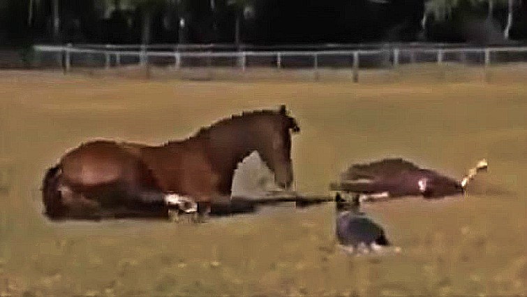 When a woman looked outside of her window into the backyard, she was understandably surprised to see a huge horse lying on its side. While anyone would certainly be taken aback by the presence of a huge horse lying down, what makes this video even more bizarre is the fact that there are three animals in total!