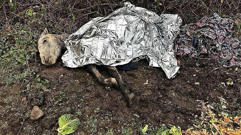 The mare was found on a patch of bare ground that appeared churned, possibly by her efforts to get to her feet. Near her was a pile of vegetable peelings, along with broccoli and cabbage leaves.