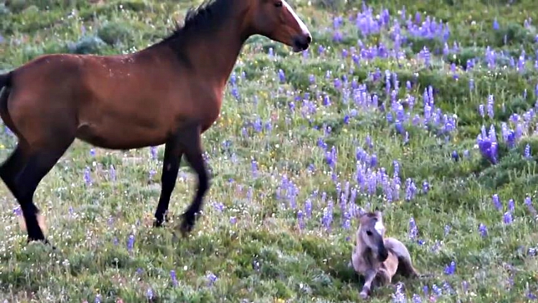 A mother would do anything for her babies, even risk her own life so that the baby is not hurt or injured. And this is exactly what you are going to watch in this video, how a mare protects her newborn foal despite being alone and surrounded by a herd of wild horses. The mare sees the wild horses approaching and stands up immediately to the protection of her little one.