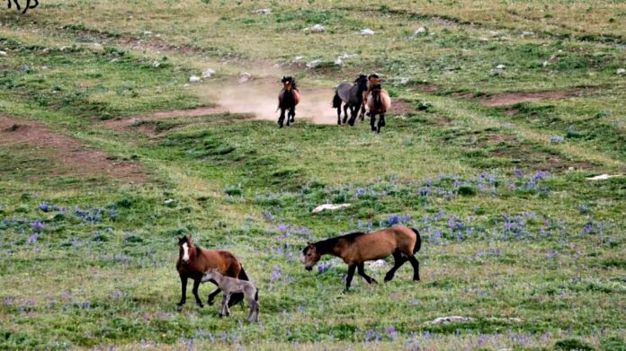 Mare Protects Her New Born Foal From A Herd Of Wild Horses