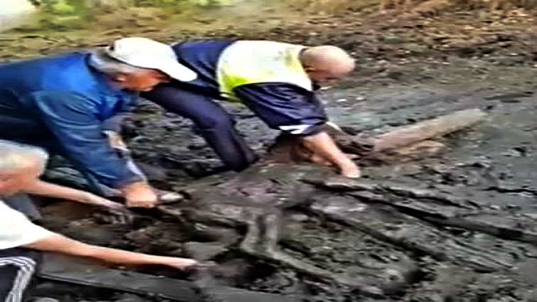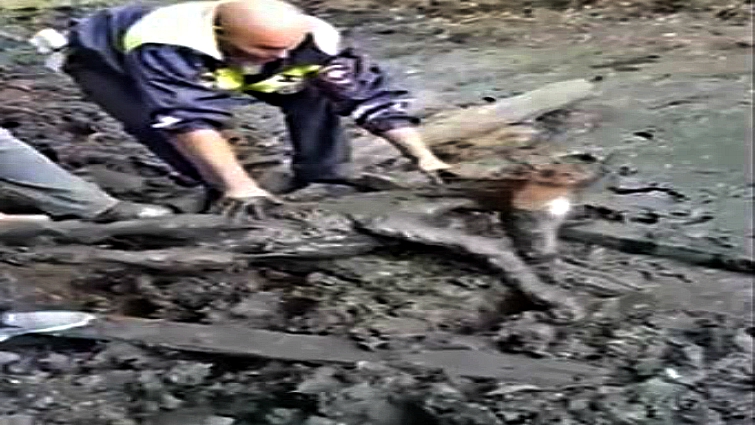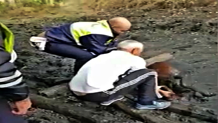 The little one ended up in the trap, and his mother watched helplessly as her owner and the cop struggled to tug him out of the mud. The foal had also been born just moments before. Luckily, both mother and baby made it out of the ordeal alive.