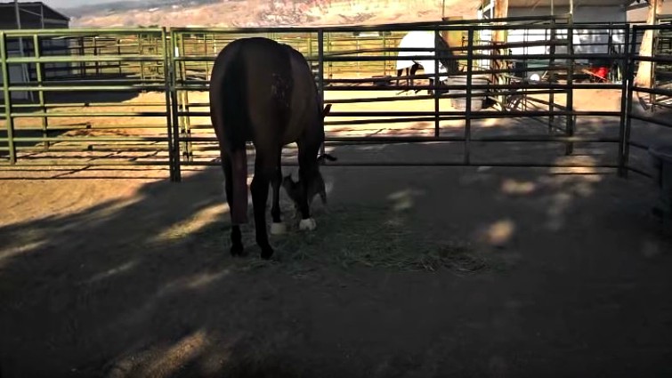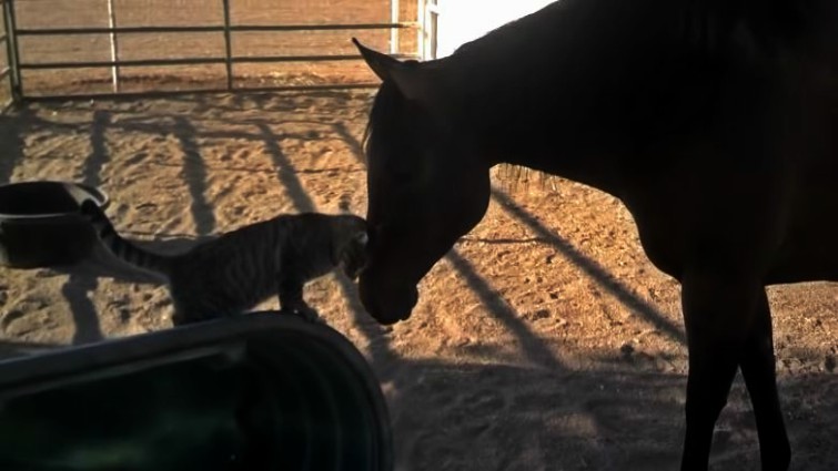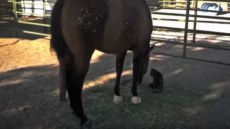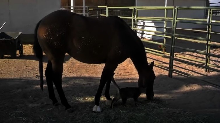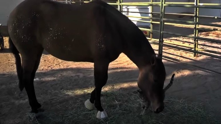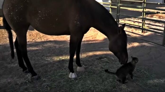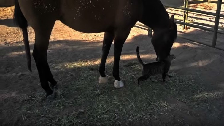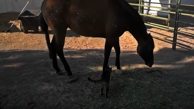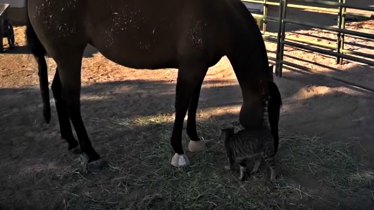 In this touching video, two very unlikely animals form a unique bond that can only be described as beautiful. Who would have ever thought that a giant mare would befriend a tiny farm cat? That’s exactly what happens in this video and it’s sure to bring a smile to your face. Midget, a 3-year-old filly, “pets” this kitten cat every morning.