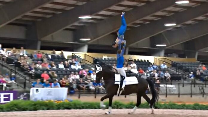 What you are going to watch in this video is a Pas Des Deux (a dance for two people) vaulting performance which if described in one word is ‘stunning.’ A performance that fully deserved a gold medal. Having been out over the last year with a broken leg, Lorenzo Lupacchini comes back strong to join his partner Silvia Stopazzini to show an energetic and incredible show. There are some people who think that this is weird or silly and it has nothing to do with horseback riding but it is all the contrary.