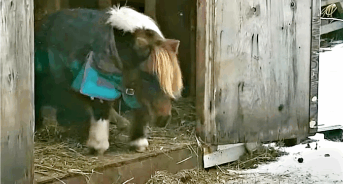 This adorable video was shared on Facebook by Beth Rose with the caption, “When it’s snowing, so your human puts your hay inside, but the step is too high and you are too short. So you throw a temper tantrum.”