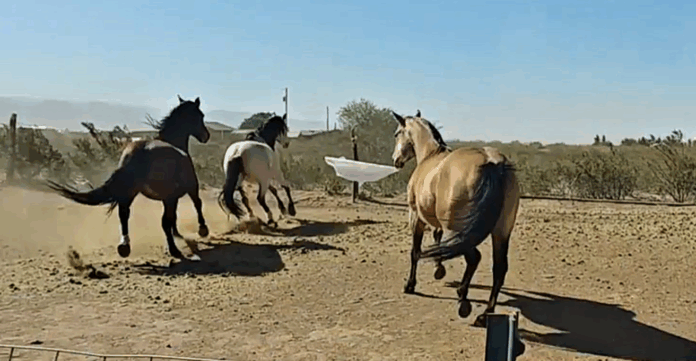 It’s sufficient for horses an object small enough but that attracts their curiosity to make them playful and run around like crazy. Apparently, the horse in the video named JeuJeu has found a new toy and just wants to show it off to her friends but her friends don’t respond the same as they are scared by what JeuJeu is carrying in her mouth.