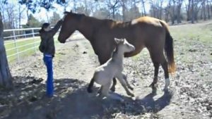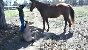 But what about horses? Do they sneeze? What you are going to watch in this video is a cute adorable foal sneezing and then tumbling over adorably. This happens very quickly and no one expects it to happen. The cute foal sneezes so hard that the foal can’t maintain its balance and falls over from its force. The girl in the video is startled at what happened and the mare simply doesn’t know what to make of it.