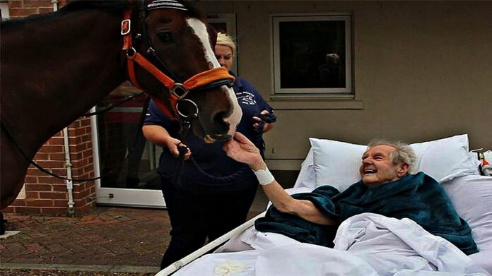 All he wanted to do was feed a horse one last time. Patrick loved the equestrian lifestyle and horses ever since his father, Victor, introduced him to them. Nurses at the North Devon Hospice then arranged to have a stallion, also named Victor, come visit Patrick from the North Devon Equine Rescue Center. They wheeled the man outside, where he came face-to-face with the giant horse.