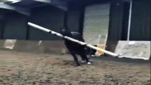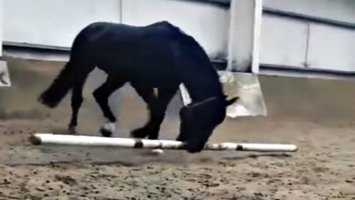 Maybe, this one doesn’t want anyone to install his training session as he wants to do it himself or he might prefer to play with the jump poles rather than jump them. Who knows? Horses can be up to anything. Personally, I think this horse is showing his baby side and is enjoying his play time. Watch this funny video!