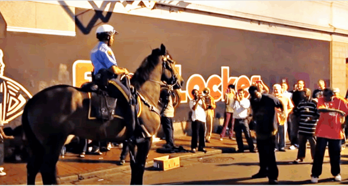 One might not believe the way the horse dances to the rhythm if it weren’t recorded on camera. Everyone is aware that a good beat is necessary for dancing. We get to hear that fast rattatata of the steel drums being hammered as the horse and rider approach. As you get closer, you might assume that the policeman will try to put an end to the musicians and dancers’ celebration.
