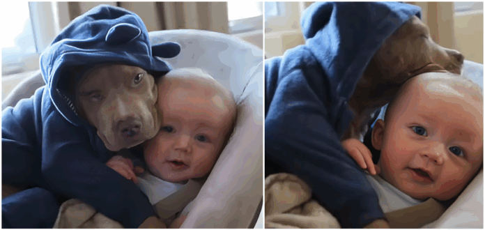 It tells us that sometimes, the most profound connections are formed not through grand gestures or eloquent words, but through the silent language of cuddles, the shared peace of a nap, and the unspoken vows of friendship that begin in the earliest chapters of life. As this sweet American Bully puppy and its baby companion continue to explore the world side by side, they set a beautiful example of the love and joy that come from true friendship. Their journey, just beginning, is filled with promise—a reminder that in the vast tapestry of life, the purest forms of happiness often come in the most unassuming packages: a puppy in pajamas, a baby’s laughter, and the unbreakable bond they share.