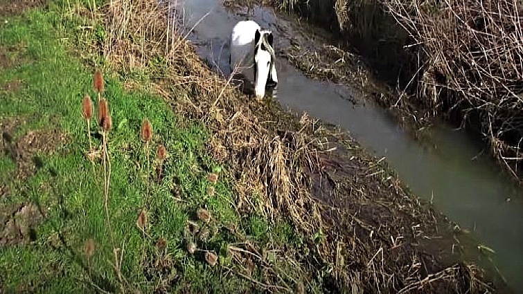In fact, inside the water-filled ditch was a white mare. She was exhausted and stuck and seemed to be resigned to her fate. She was even eating plant shoots around her, unable to pull herself out. She also happened to be pregnant.