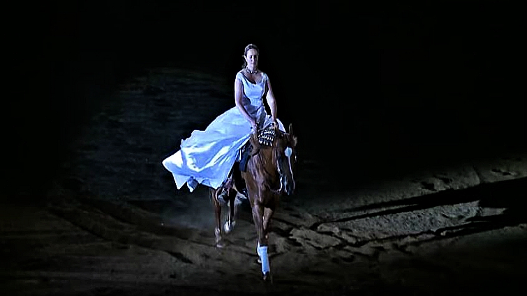 After Heather emerges in her flowing white gown, she and her incredible horse left the audience stunned. Not only does she handle the horse with comfort and confidence, but together they display gorgeous harmony between horse and rider. Everything in the video is magical from the rider and her dress, the horse itself and the scenography too.