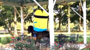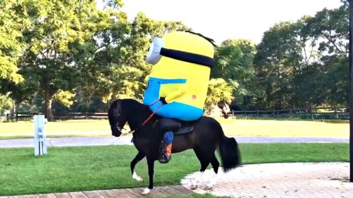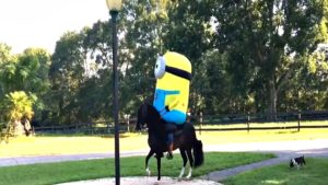 We have watched the video of a rider riding a horse in a T-Rex dinosaur suit and that video went viral with millions of viewers on social media. The man didn’t stop and has posted another video which will make your day a little brighter. He’s now at it again with his funny tricks and this time it is no different, except that he has chosen a minion costume.