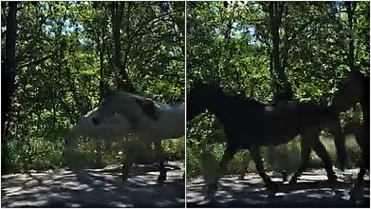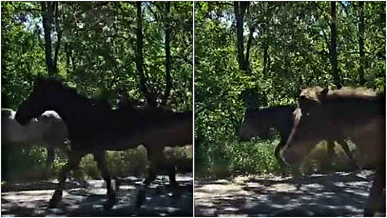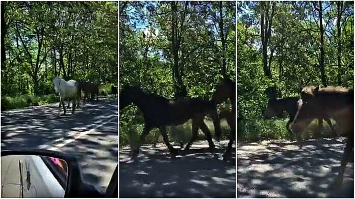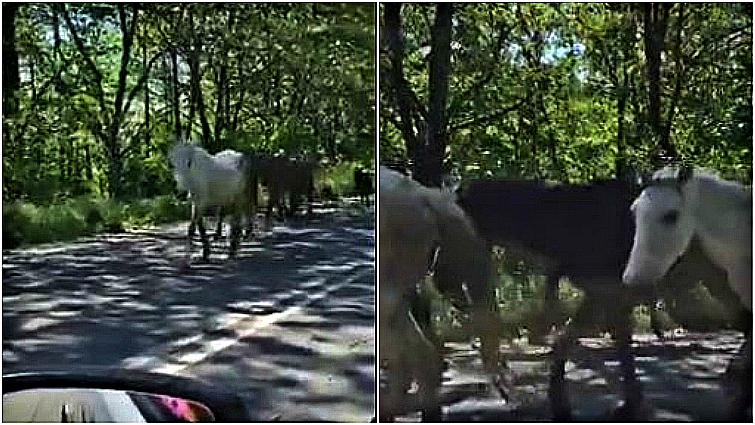 The road completely closed down in order to allow the horses to pass. As one woman travels in the opposite direction of these magnificent creatures, she records a glimpse of the incredible sight to see. Moms and their babies, brown horses, white horses… horses of all kinds pass by. It’s strange to see them sauntering down the road like this, but also so wonderful that the people in charge decided to close the roads to let them safely pass.
