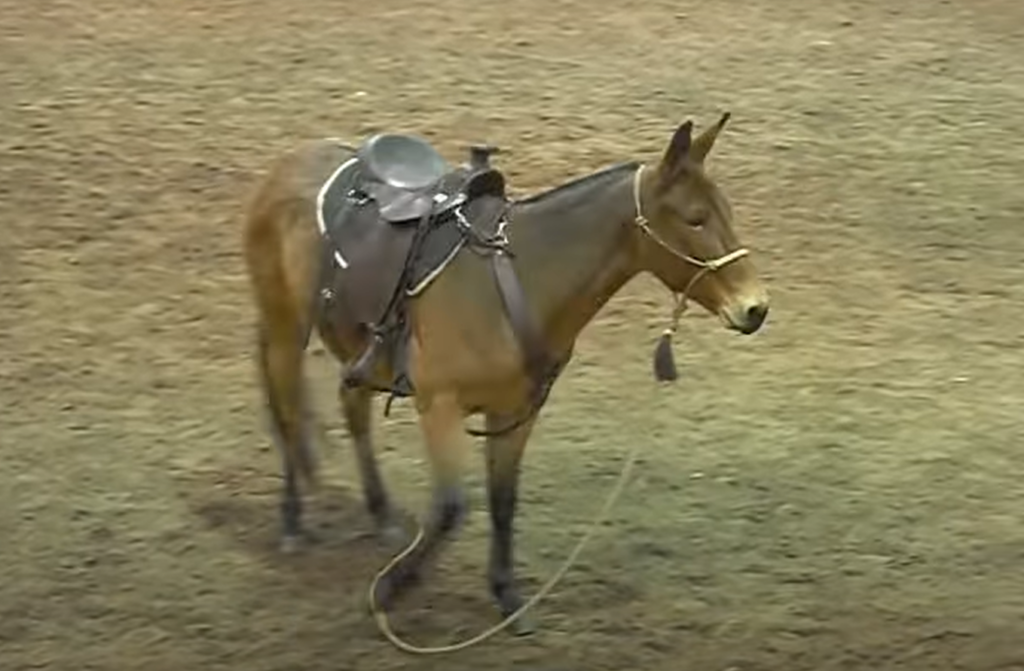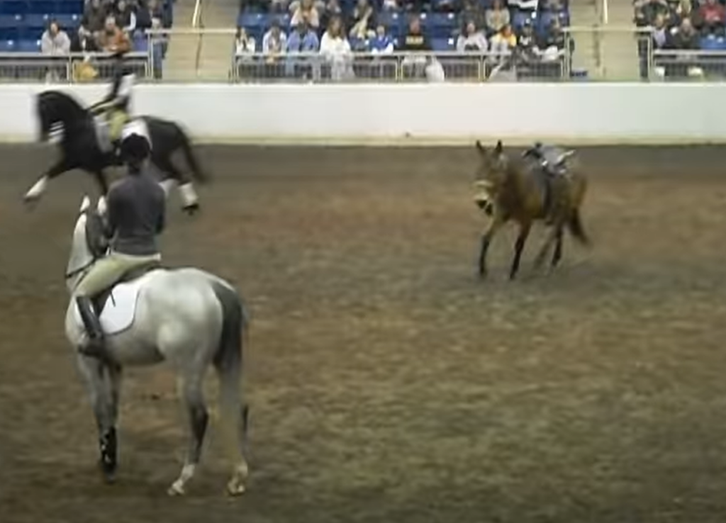 This is what happened during a competition when a runaway mule entered the arena, dragging a lead rope and ruining the performance of both the rider and the horse. But when you see the mule running around the arena, bucking and at one moment trying to lie down you can’t help it but love this mischievous mule.