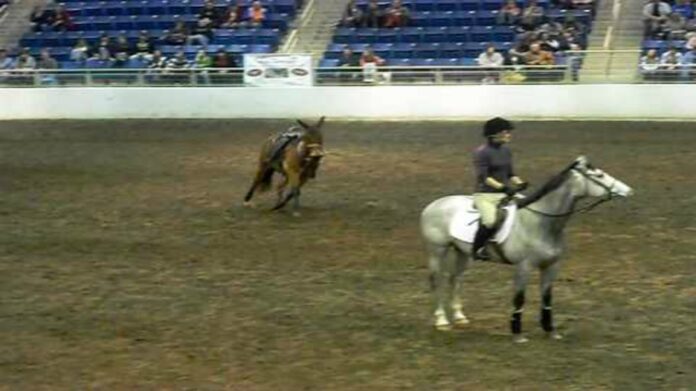 This is what happened during a competition when a runaway mule entered the arena, dragging a lead rope and ruining the performance of both the rider and the horse. But when you see the mule running around the arena, bucking and at one moment trying to lie down you can’t help it but love this mischievous mule.