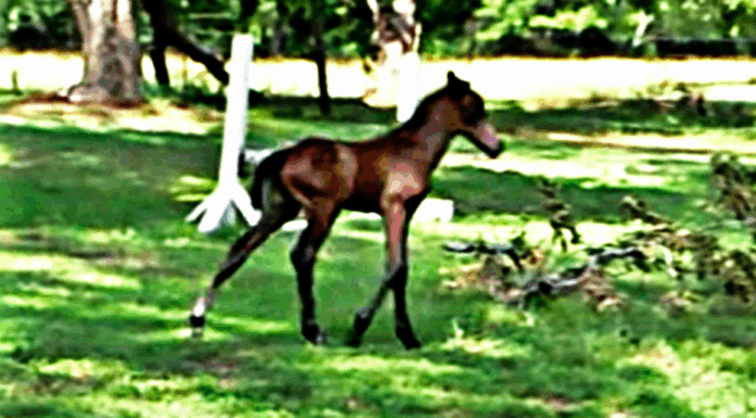 I am pretty sure that the majority of you have at least seen a baby foal in person. Foals are one of the most adorable creatures in the world and it is funny how different they are from the fully grown horses. Usually, a grown horse is very calm and stubborn while the little foals are very playful and it is almost impossible to stop them from running around the barn the whole day. This horse foal, only 12 hours old out for a stroll with his mother decided to jump, truly is what he’s born to do and he appears to love it and have such a great time during the video.