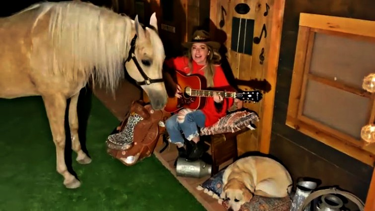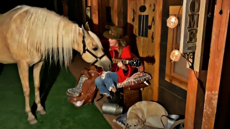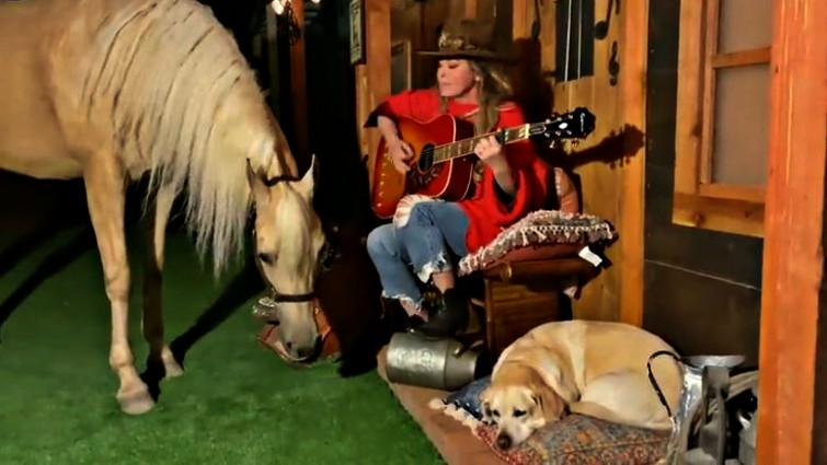 Now, like all of us, she is quarantined in her house and decided to deliver another amazing performance. In this performance, she again incorporated her horse and her dog who were also her special guests that were really entertained by her performance, especially the horse who couldn’t hide the excitement after hearing her sing a Medley of two of her biggest hits ‘Honey I’m Home’ and ‘Man! I feel like a Woman’.