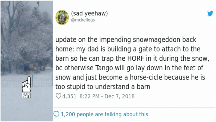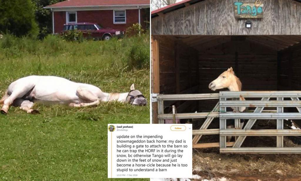 Twitter user @mcKellogs shared Tango’s hilarious actions in a thread to show how their horse was the one that needed the most care and attention while they should be preparing for the cold season. Unlike other animals in the barn which instinctively know how to get to a warmer and safer place like the barn when the cold weather hits, Tango does not.