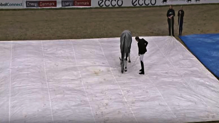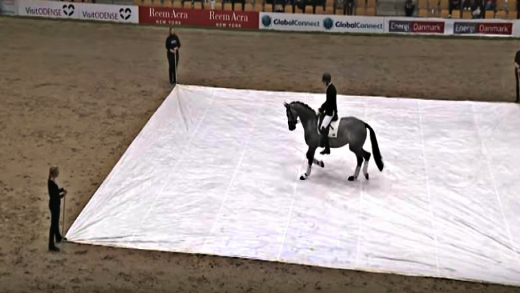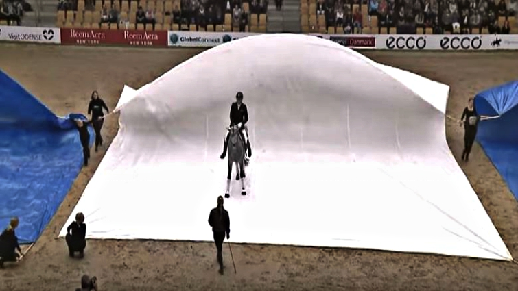 Horses are usually very scared of that object, that’s why this horse is unique. When an unusual object comes near horses, they can quickly become nervous and tensed, but Esmeralda is not one of them. While tarps are dragged behind and even when they covered her body completely she still remained calm.