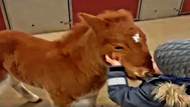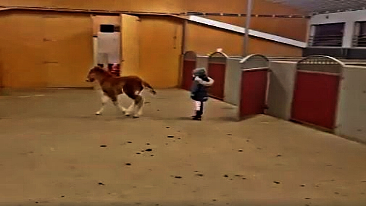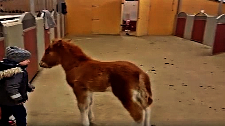 Suddenly, the young child takes a step back to open the door all the way. That’s when the baby horse gallops out of his quarters and out into the open. A larger horse follows, and the 5-year-old seems like he is in shock. As the horses emerge, the toddler yells, “Whoa!” Then, it’s time for the boy to show off his friendship with the chestnut-colored foal.