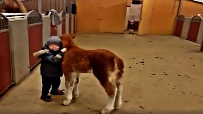 A bond like this one is special and rare. There’s truly nothing like a little boy and his foal. In the video below, posted on December 16, 2016, a 5-year-old boy walks up to the red wooden door of a horse stable. There is a small foal standing by the entrance, and the boy grabs his face firmly to say hello.