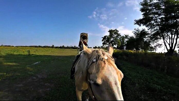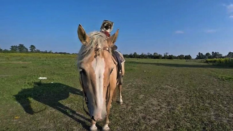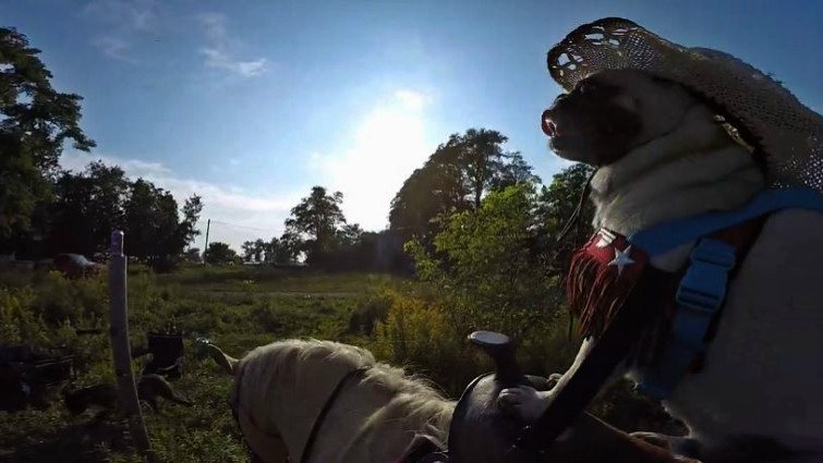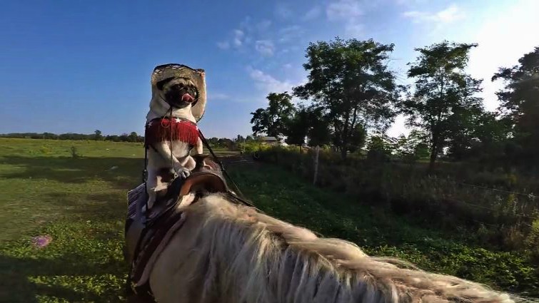 Atom the pug is quite the adventurous little fellow. Well-loved by his canine companions and the other farm animals living with him, he has no shortage of friends and activities to take part in. But it seems that he takes pleasure in one pastime in particular: horseback riding! Watch the clip of Atom riding around his farm, like a little human. The happy pug rides his horse friend in a cowboy costume, too!