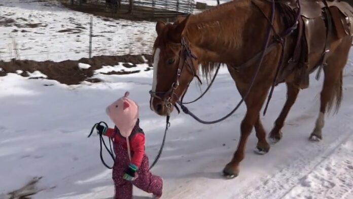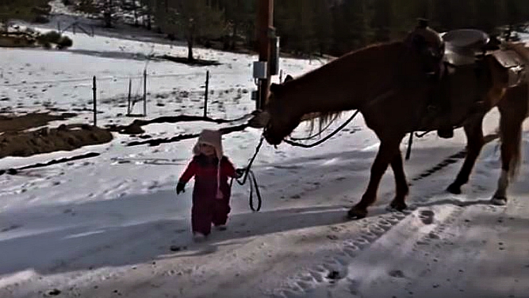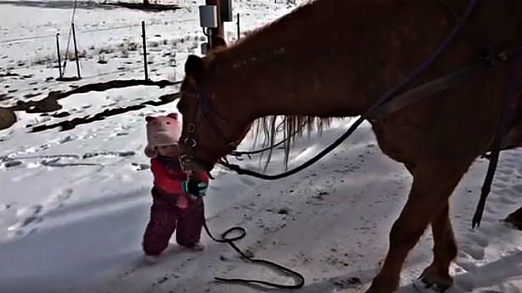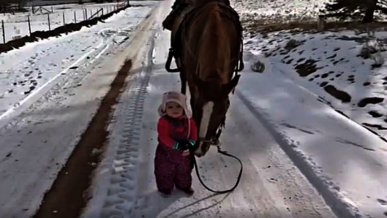 So when Dad saw his little girl, Emma, and her huge mustang named Cinnamon, he knew he had to get his camera out as quickly as possible. It seems that these two best friends were going back to the stables after a quick walk in the snow, and even though Emma is a baby, she already knows her way around a horse!