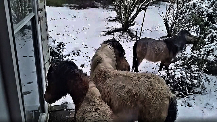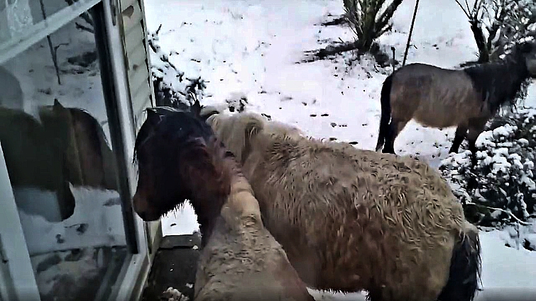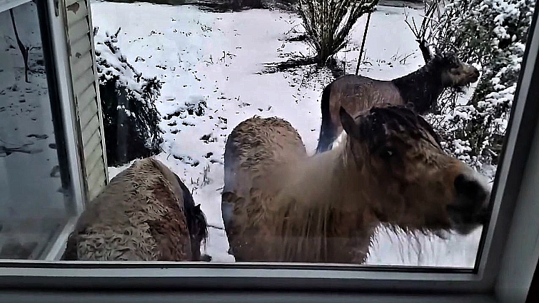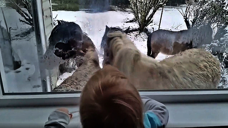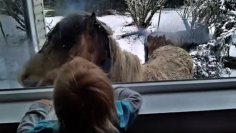 The young girl was inside her home with her mom, Brenda, the owner of the Little Hooves miniature-horse ranch. It was a bright snowy day when three curious mini horses decided to go exploring. What came next was beyond cute. The three mini horses made their way to Brenda’s warm home, where she and her family were gathered inside. Once she saw the small equine friends approaching, she grabbed her camera to record the beautiful moment.