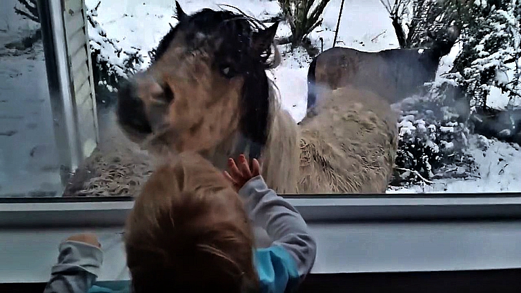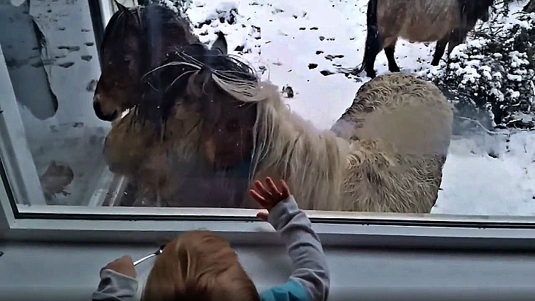Suddenly, her toddler noticed the mini horses standing outside her window and she went to investigate. The toddler, who was holding a silver spoon at the time, tried her best to peer over the bottom of the window for a full view of the mini horses. Then one furry friend, in particular, stood out to her. Not only was this baby girl attracted by the beauty and cuteness of the miniature horse, but the miniature also seems to have found an amazing friend. Simply heart-melting!