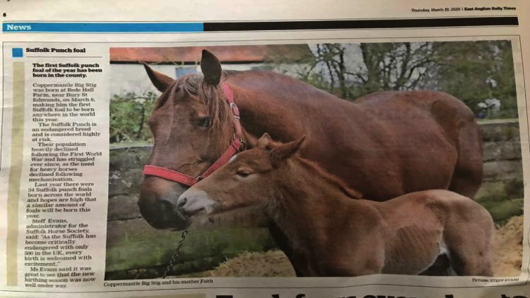 The birth of the rare breed foal was definitely what this breed needed. Pauline and Clive Wainwright welcomed Suffolk colt Coppermantle Big Stig from their five-year-old mare Horkesley Park Faith. Suffolk Punches generally stand 16.1 to 17.2 hands (65 to 70 inches, 165 to 178 cm), weigh 1,980 to 2,200 pounds (900 to 1,000 kg), and are always chestnut in color. The Suffolk is shaped with great width in front and in the quarters. Its short legs and resulting low draught give it a direct pull on its vehicle.