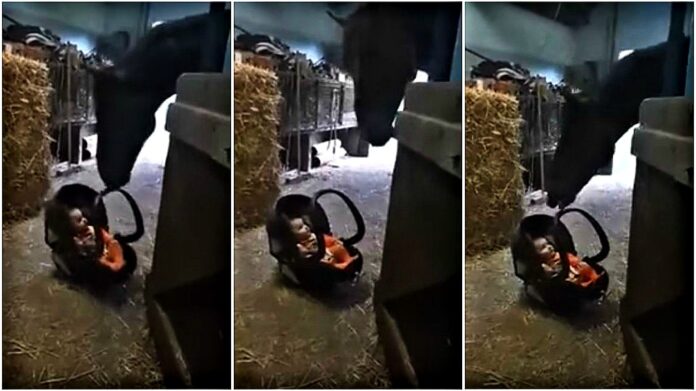 A little toddler by the name of Ruby got the experience of a lifetime when a horse named Red started rocking Ruby’s baby seat. Red was still in his stable, but he wasted no time offering his nose to rock Ruby back and forth in her chair. In the video, Ruby screams and squeals with delight as Red rocks her gently. The little bundle of joy can’t contain her excitement for the lovable horse!