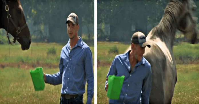 The man in the video is Taylor Hanes, a very talented horseman who is known all over the world for his beautiful performances. As you can see, Taylor didn’t do anything to that horse but she still couldn’t contain herself and immediately expressed her jealousy. He was shooting an ad for his line of performance horses and everything seemed fine until he gave a compliment to one of the mares.