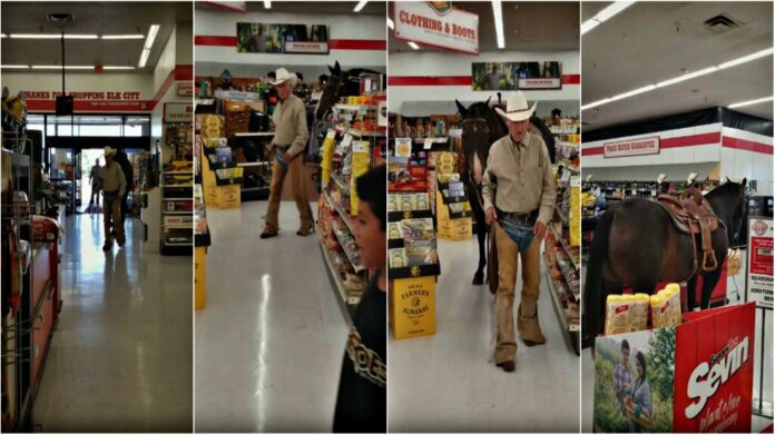 However, in Oklahoma, one man was very happy when he found a tractor supply store that would allow him to bring his pet into the store, as long as it was on a leash. Another shopper in the store, Robin, managed to capture this occasion on camera. While shopping, Robin saw a man in full cowboy attire come into the store. The man went to the clerk and inquired if what the sign said was true about allowing animals inside, as long as they were on a leash.  Upon confirmation that the sign was correct, he asked if it included his pet, a senior horse.