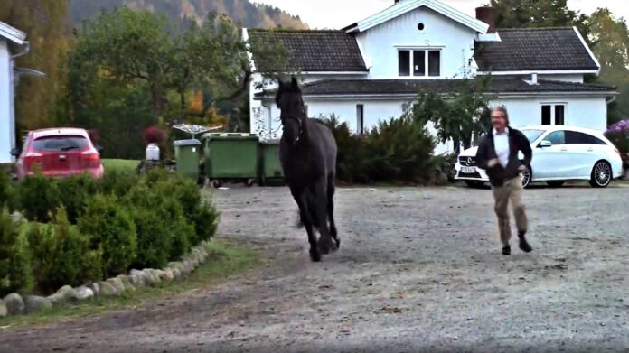 He runs around the garden along with his horse and just when he stops the beautiful Friesian horse walks into the trailer peacefully. No one can make horses do anything they don’t want to do; you just have to find the right way to communicate with them.Â