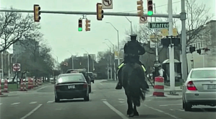Officer Brandon Murphy of Wayne State University Police Department and Detroit Police’s mounted unit noticed a driver texting and not wearing a seatbelt. He just put his horse Remy on the chase and pulled the driver over and did what he had to do, issued a ticket.