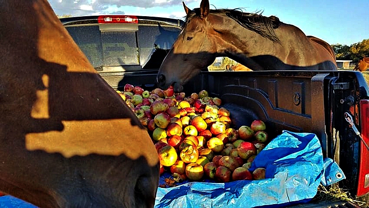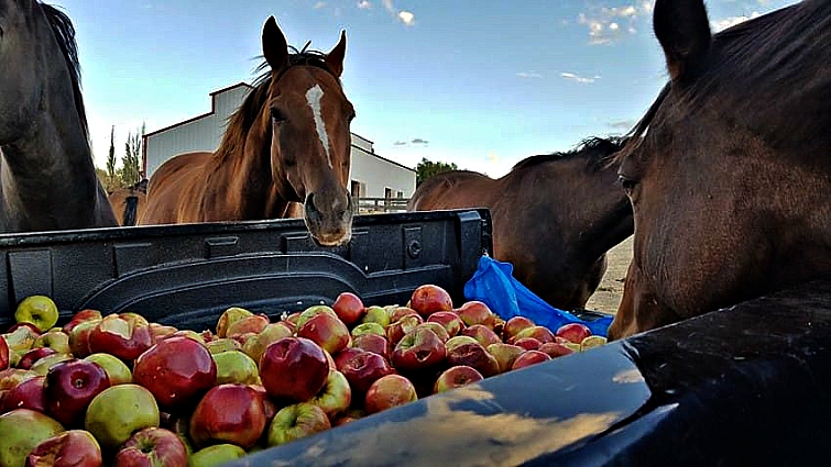 Still, even though these horses are consummate professionals, they still enjoy their leisure time. If you know horses, you know that “leisure time” often codes for following your favorite people around and begging for delicious treats. Horses know that people are all secret softies at heart, and if you nuzzle and whicker enough, you are bound to eventually end up with a tasty carrot or two. But of course, the holy grail of happy horse snacking is the apple.