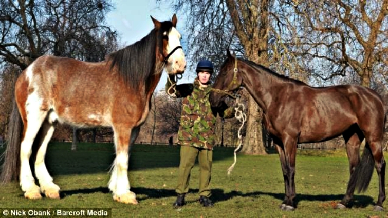 10.The size difference between this Draft horse and this average-sized horse, might make you think it’s an optical illusion!