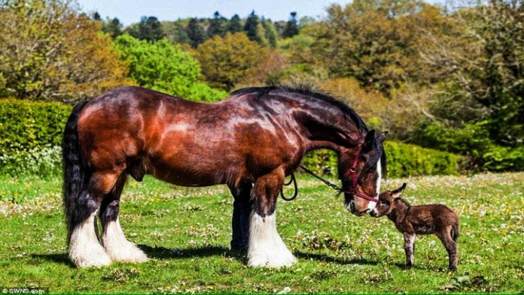 6.The size contrast between this huge Clydesdale and this little donkey is amazing. The donkey’s whole head could fit into one of the Clydesdale’s nostrils!