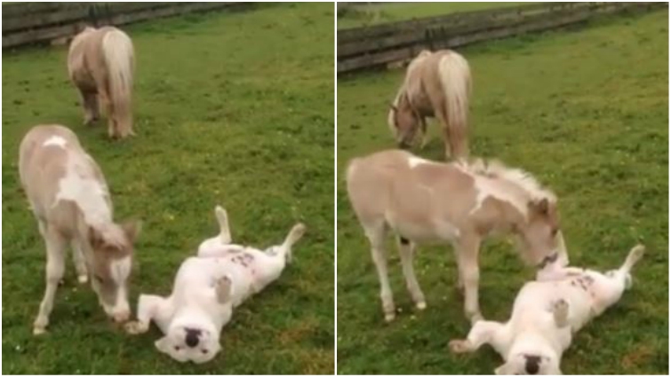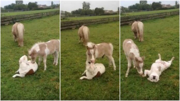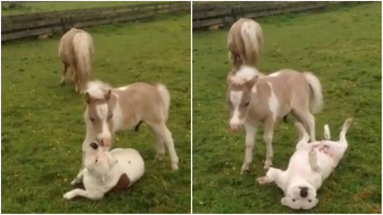 When choosing a sparring partner, it’s a good idea to pick someone from a similar weight class. That’s just what Tara, a foal-sized Stafford, found in Aladdin, a dog-sized miniature horse.