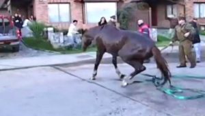 Evidently in distress, firefighters were called to rescue a horse that fell down a well in Chile. The horse’s rider said the animal became frightened by a passing vehicle, jumped and fell into a well. Onlookers and the horse, despite being tranquilized were uneasy and nervous during the complicated rescue.