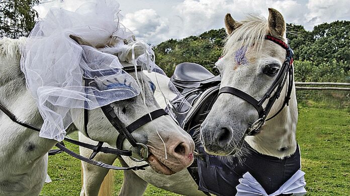 Two ponies have tied the knot after their owners arranged a wedding ceremony complete with bridesmaids, pageboys, tea and a “first dance”. The Welsh section A bride Daisy, 15, and 22-year-old groom Raffie are owned by 10-year-old Lucy Wells and her best friend Georgie Orgill, who had been planning the elaborate ceremony since the start of the summer holidays.