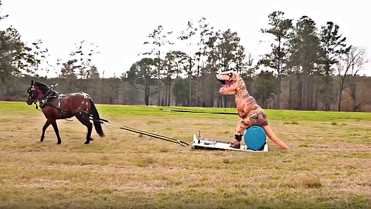 By now we have seen a lot of hilarious moments between equestrians and horses, but the one in this video is definitely something not to miss; what you are going to watch is a man wearing a dinosaur suit (Jurassic Park style) riding a horse.