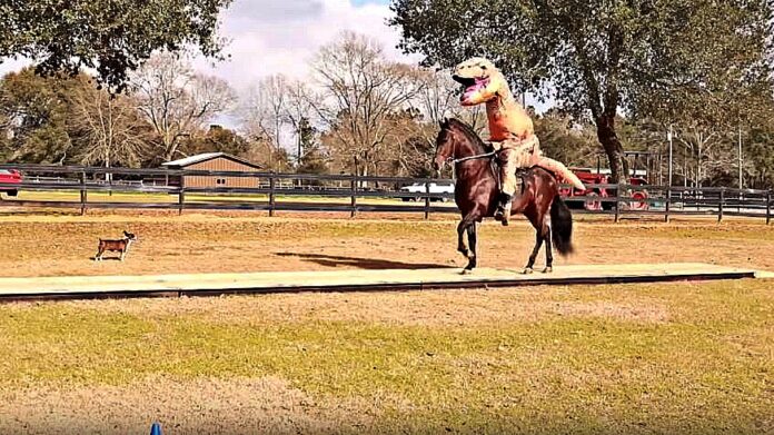 By now we have seen a lot of hilarious moments between equestrians and horses, but the one in this video is definitely something not to miss; what you are going to watch is a man wearing a dinosaur suit (Jurassic Park style) riding a horse.