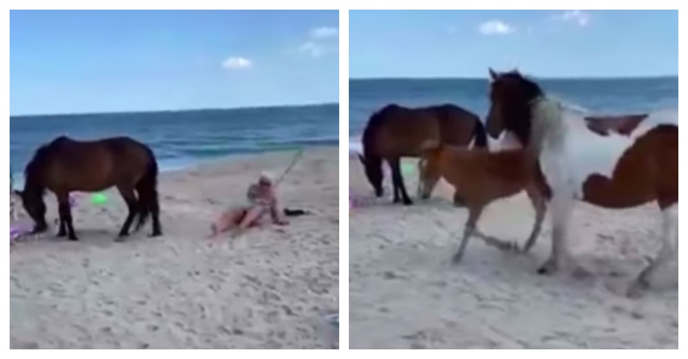The horse picked up where it left off and the woman tumbled into the sand. As they joined the first horse, a second horse and a baby appeared to have discovered something intriguing on the towel. Visitors are expressly forbidden from approaching or touching the horses, according to signs. The woman, however, regained her balance and moved to approach the horses once more, shovel in hand.