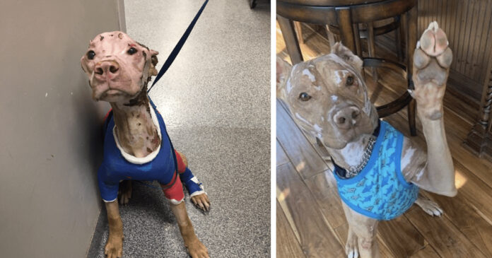 Justice the Pit Bull’s story is a poignant reminder of the resilience of animals in the face of adversity. Found wandering the streets of Indiana in 2018, approximately two years old and suffering from severe chemical burns, Justice’s survival was nothing short of miraculous. The intentional nature of his injuries would have spelled the end for many, but Justice was no ordinary dog. His journey from abandonment and abuse to a life filled with love and care exemplifies the transformative power of compassion. Upon his rescue, the Shelbyville/Shelby County Animal Shelter became Justice’s refuge, providing him with the medical attention and affection he desperately needed. Initially wrapped in bandages, Justice’s physical and emotional wounds began to heal, thanks to the dedicated efforts of shelter staff, including veterinarian Jessica Lynch. Despite the irreversible scars and the loss of his original appearance, Justice emerged as a beacon of hope and strength, his spirit unbroken.